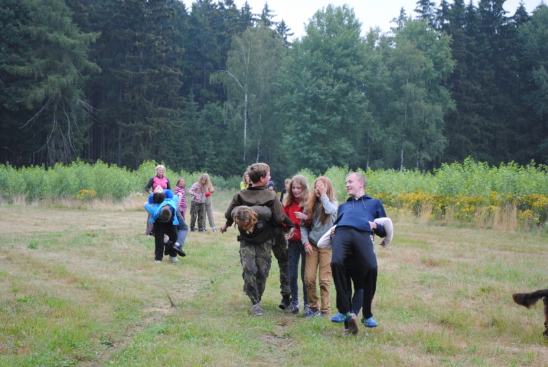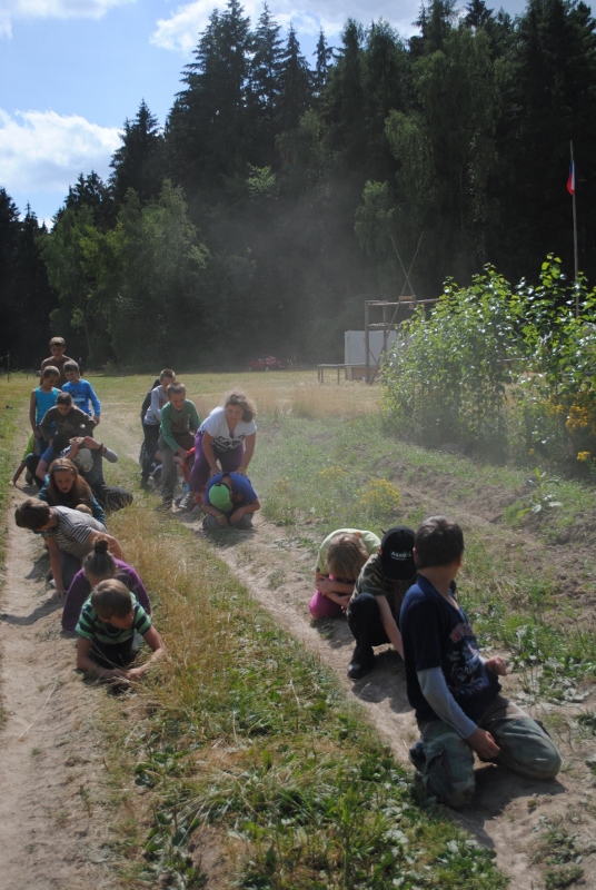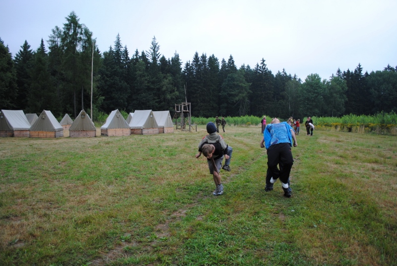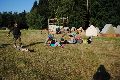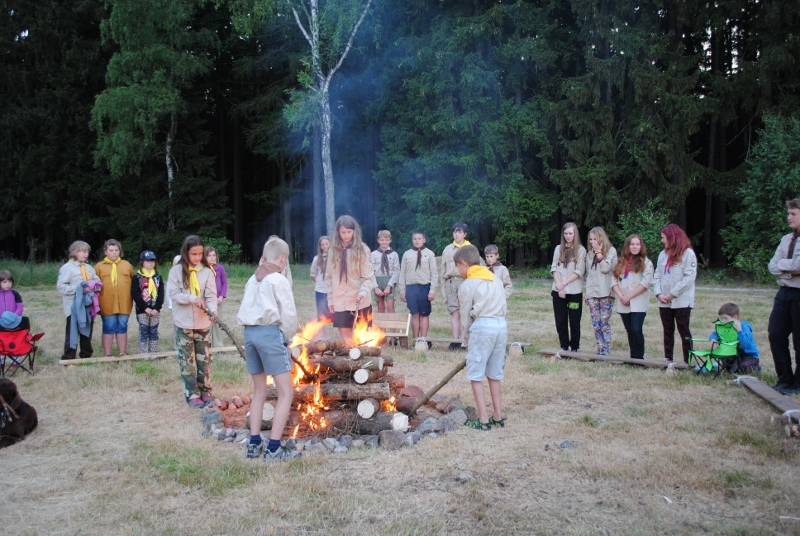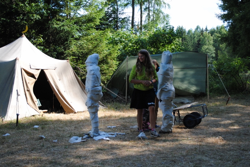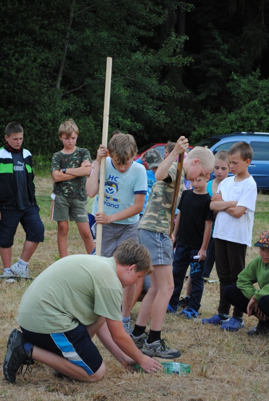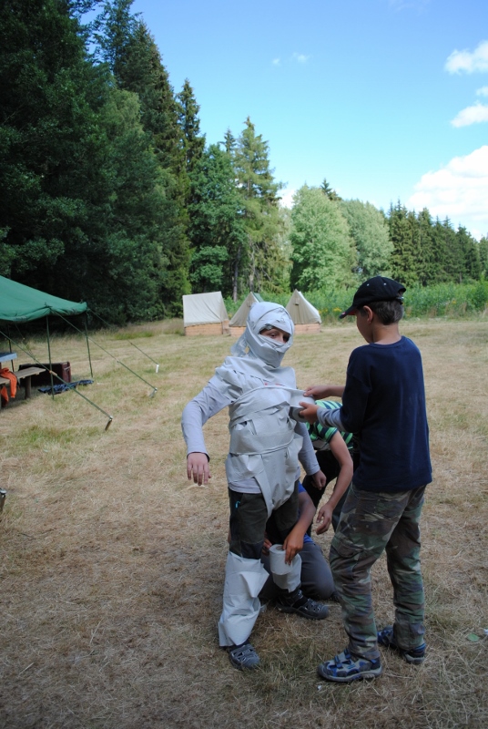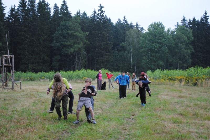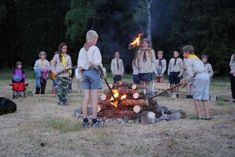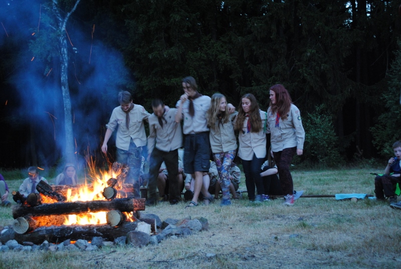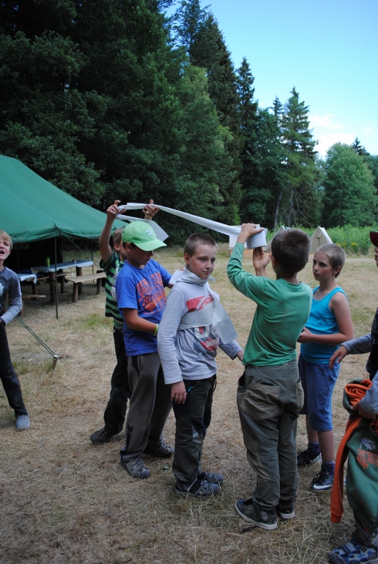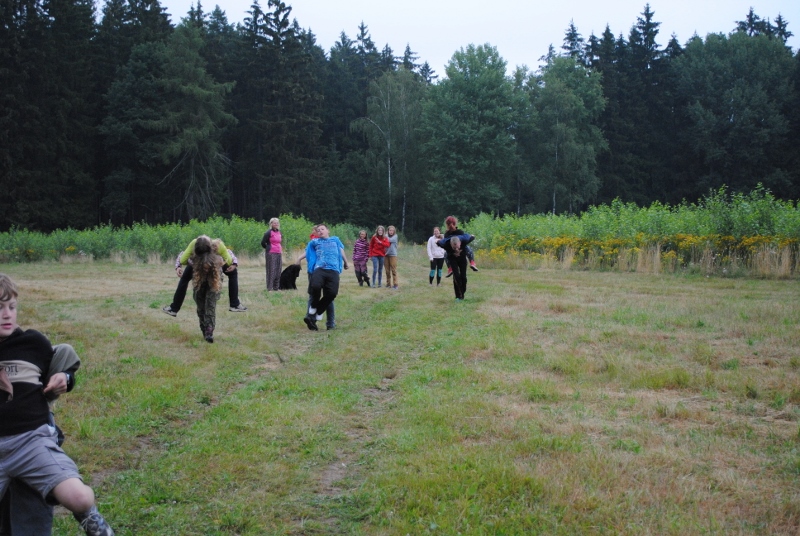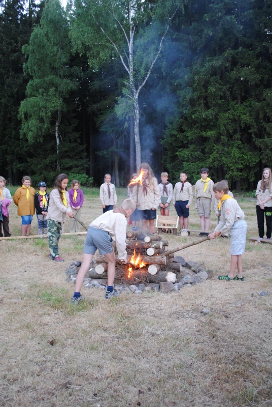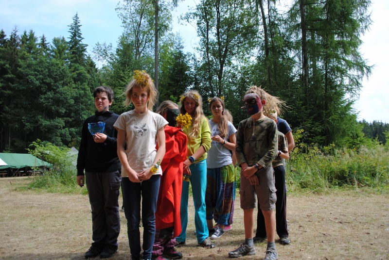 I letos jsme se vydali na naše osvědčené tábořiště Kousky. Tentokrát světlušky a vlčata jely jen na jeden týden tábora, ostatní skauti ,skautky a RS s RG na 14 dní. Jelikož louka Kousky je opředená bohatou historii a sahá až do 16 století i tábor se nesl v tomto duchu. Na louce dříve bývala německá osada jejiž existenci dokazují staré základy budov, studní a prostě všech možných sutin obytných budov v nedaleké blízkosti tábořiště. V Této osadě žil Josef Bokouš, ten patřil do skupiny lapků, kteří okrádali přijíždějící jezdce na koních, hledajících nocleh a odpočinek pro sebe i koně. Bokouš míchal z bylin lektvar, který podal koním a ty po ujetí několika kilometrů přestali jít a upadli do hlubokého spánku. A to byla příležitost pro Bokoušovi kumpány, kteří čekali až koně nebudou moci jít a oni je mohli přepadnout a oloupit. Za tyto činy byl Bokouš odsouzen k trestu oběšení. Rok po jeho popravě osada vyhořela v ní i jeho rodina, nutno podotknouti o Bokoušově rodině nebylo v Kronikách žádné zmínky. Duch Bokouše se jednou za čas objeví a znepříjemňuje pobyt táborníkům naposledy tomu bylo před 17 lety v roce 1998 kdy jeho duše toužila po osvobození. To se tehdejším táborníkům podařilo, ale letos poprosil táborníky, aby zachránili duši jeho syna Jindřicha, který byl upálen v sutinách jejich domu a pykal za hříchy Bokoušovi. Aby duši Jindřicha osvobodili plnili různé jeho rozmary. Nejprve museli táborníci uvařit lektvar z býlí a utkat rohož z trávy, kterou využili v očistném rituálu od sprosté mluvy. Po té každá skupina měla za úkol najít a propíchnout dračí vejce, která v sobě obsahovala infikovanou tekutinu zpropadených duší. Úkolů bylo více, zeptejte se samotných účastníků…….. Ani v samotném závěru tábora jsme se nedozvěděli zda se podařilo duši Jindřicha vysvobodit, kdo ví třeba za rok nás Bokouš opět osloví. Tak příští rok na Kouskách Vaši Vedoucí |